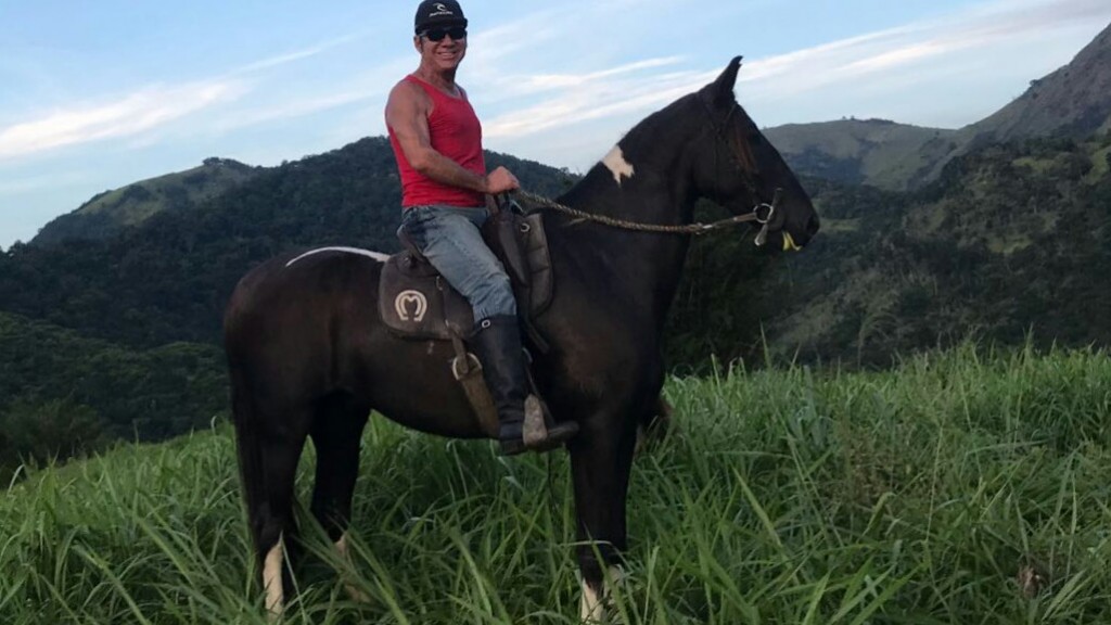 Evandro montado em Orpheu na vistoria semanal das pastagens.